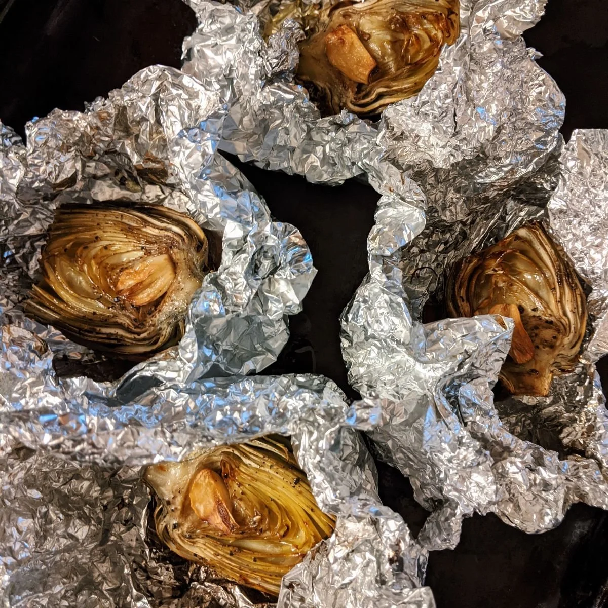 4. Wrap each artichoke half in tinfoil, place a garlic clove in the center, and drizzle with olive oil. Close the tinfoil around the artichokes and bake for 45 minutes on a baking sheet.
