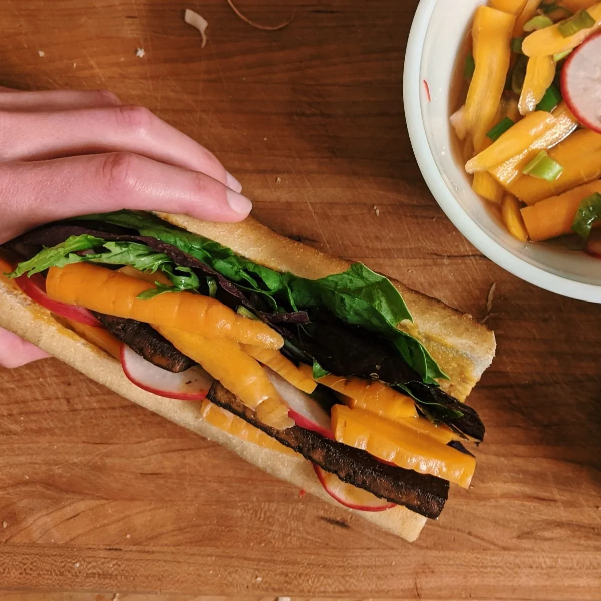 Banh mi is a soft Vietnamese baguette, often filled with vegetables, meats, herbs and sauces. Its crisp, fresh, and spicy flavors make a great sandwich for a spring lunch or dinner. We filled ours with pickled radishes, carrots, green garlic, bok choy, and soy sauce marinated tofu.