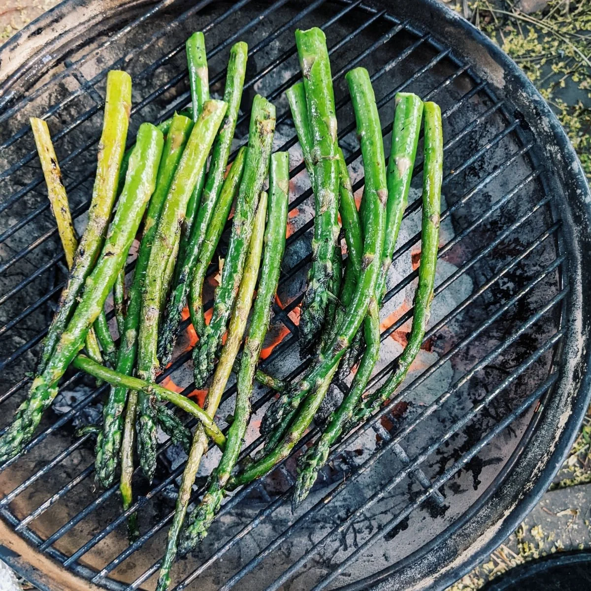 Remove the asparagus from the tin foil and place on the grate of the grill until browned or charred, roughly one minute on each side.