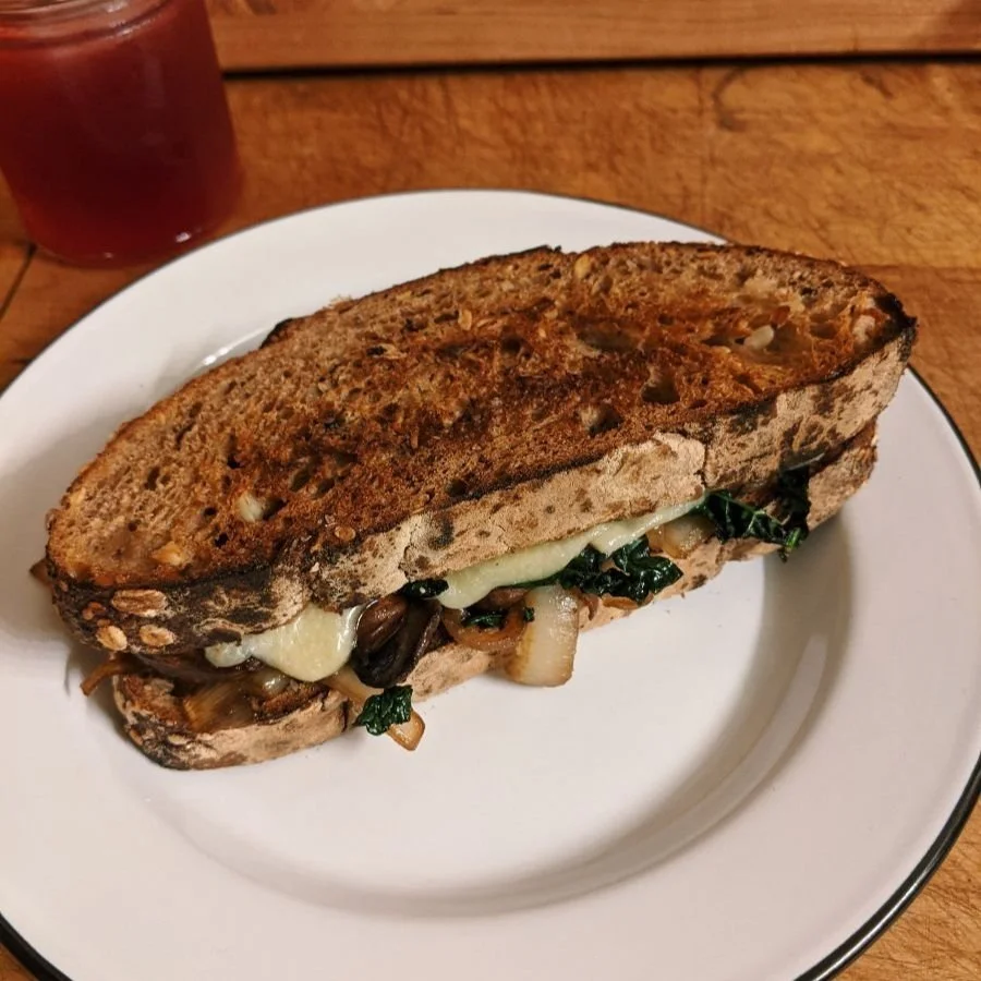 A kale, gourmet mushroom, onion, and smoked gouda cheese melt.