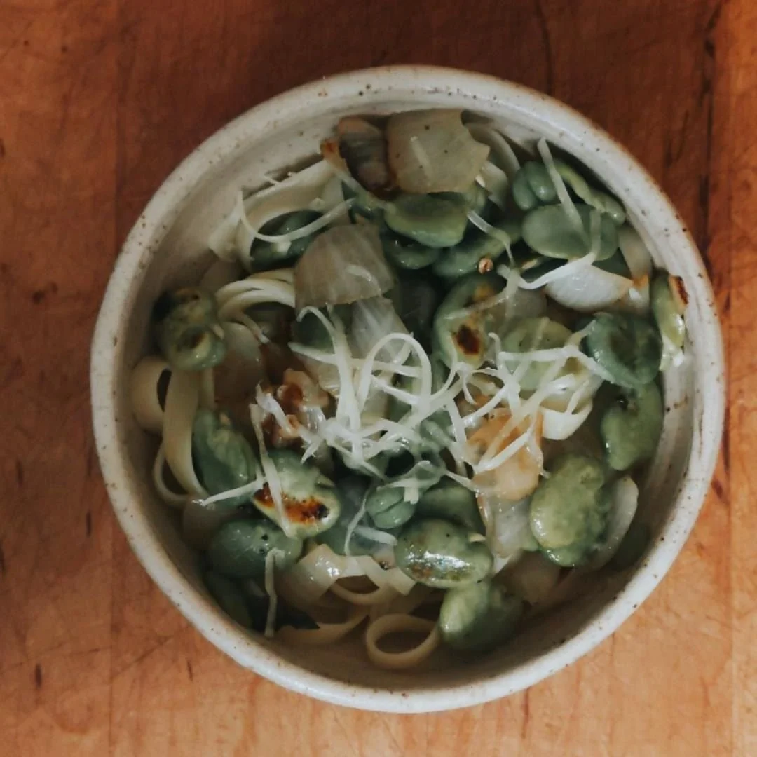 Serve by adding the linguini to a pasta bowl, layering the fava bean sauté on top, and sprinkling with parmesan cheese and fresh basil. Enjoy!