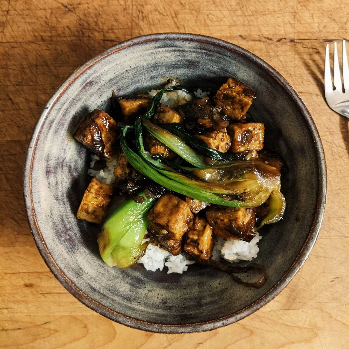 BLACK PEPPER TOFU, SHALLOTS, AND BOK CHOY
