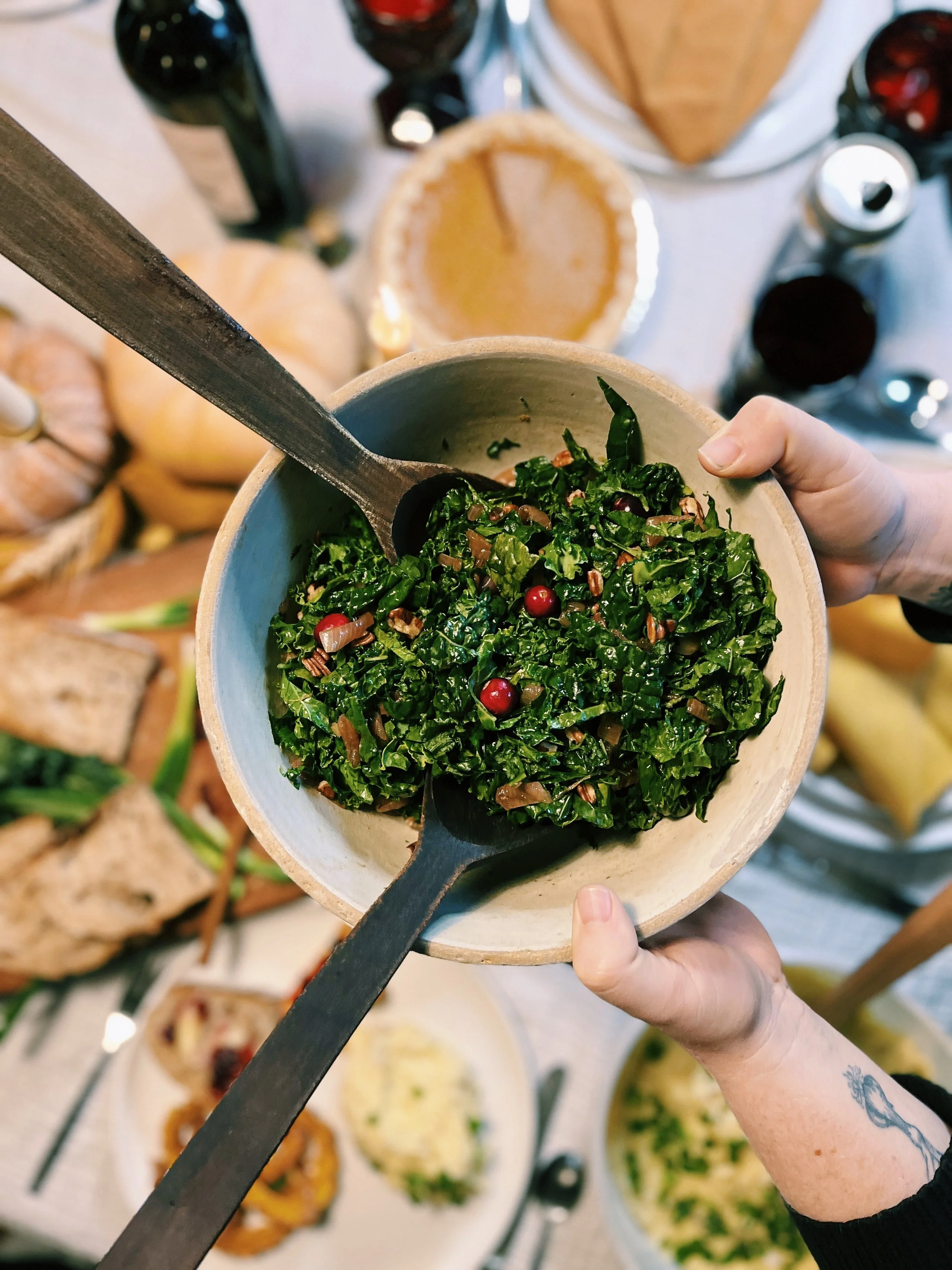 Place the kale in a serving bowl. Drizzle with vinaigrette and toss. Sprinkle with walnuts. Feast with the seasons!
