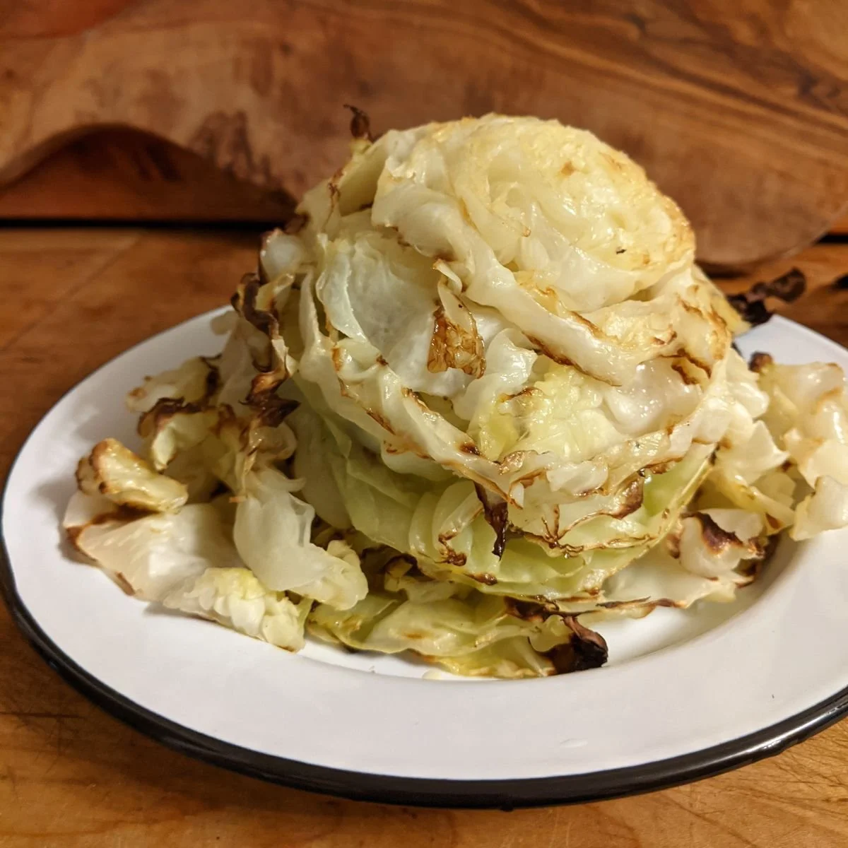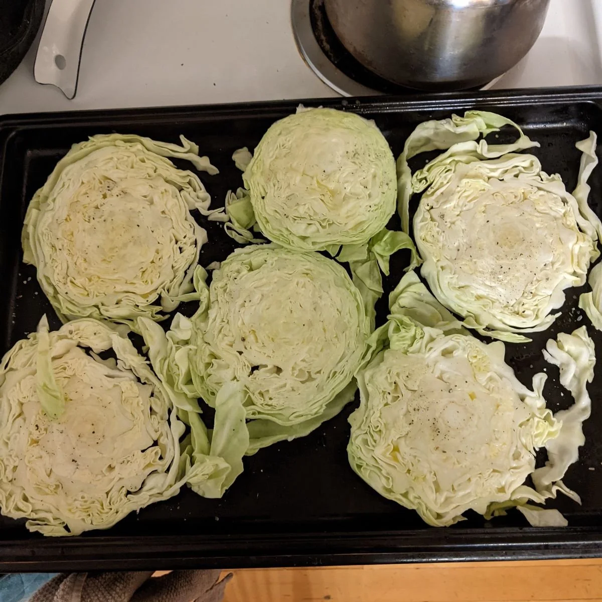 Preheat the oven to 400 degrees F. Slice the cabbage into ~1 inch thick rounds with the core in the middle. Place on a baking sheet and brush with olive oil. Roast for about 10 minutes until slightly browned and tender.
