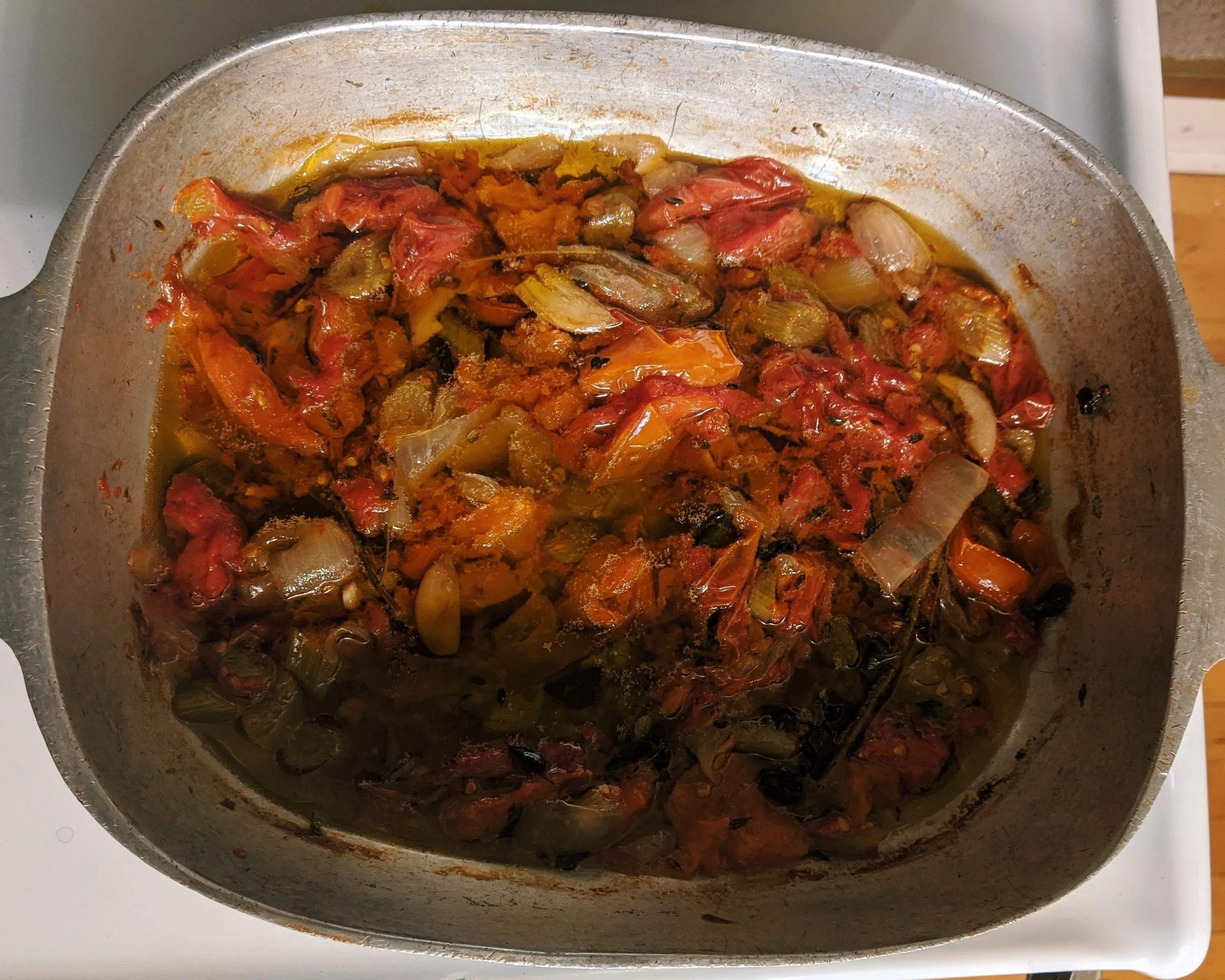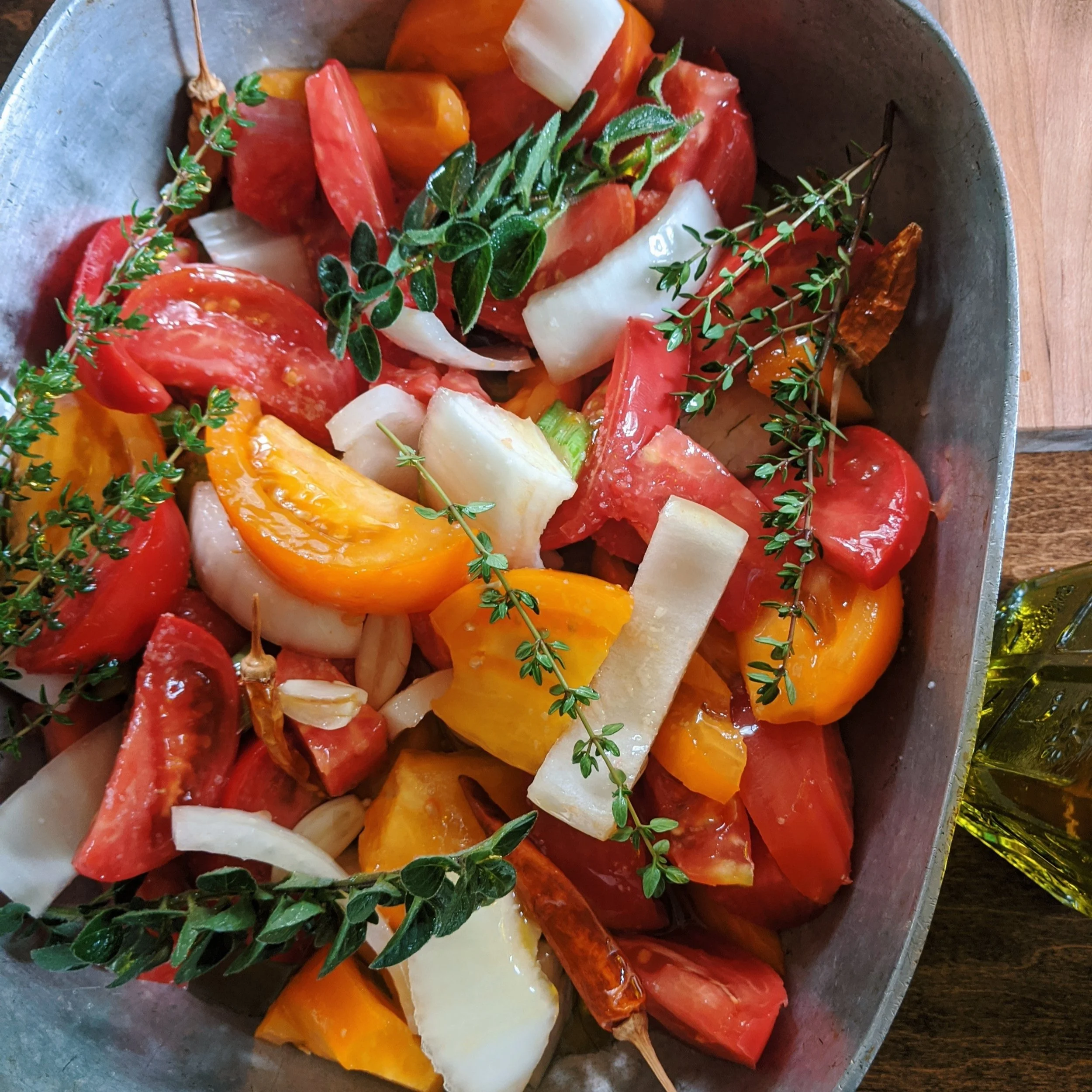 Chop the tomatoes, onion, and shallot into 2 inch wedges. Place them into an oven safe glass pan, Dutch oven, or well seasoned cast iron pan. Top with dried peppers, herbs, salt, and pepper. Drizzle with olive oil.