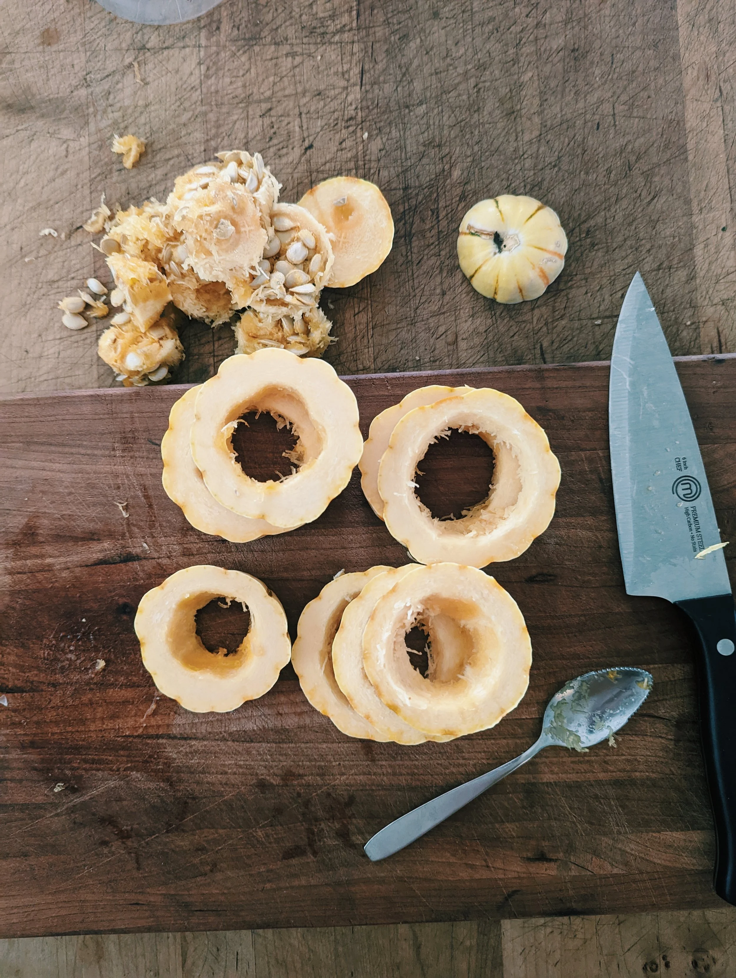Remove the ends of the delicata squash and cut into one centimeter slices. Remove the inside seeds on each slice.